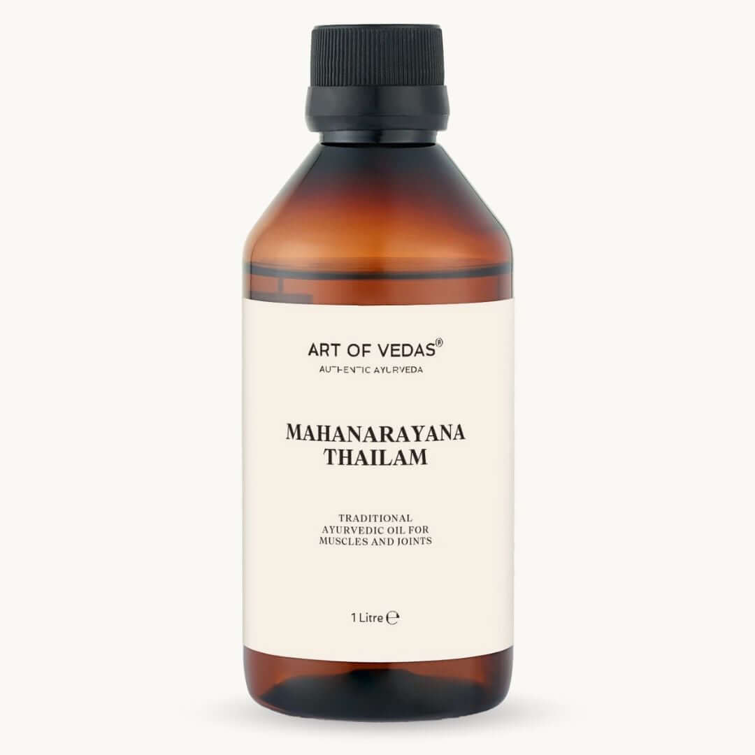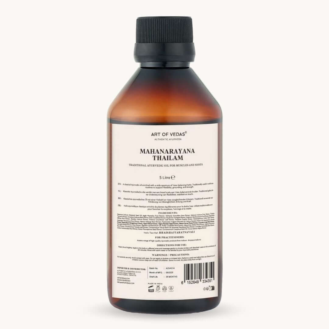 Mahanarayana Thailam je klasična Ayurvedic formulacija, ki vsebuje več kot 50 zelišč, dokumentiranih v Sahasrayogam in Bhaishajya Ratnavali. To ogrevalno olje na osnovi sezama se tradicionalno uporablja za masažo Abhyanga in pomirjanje Vata. Pripravljeno v Indiji z uporabo avtentičnih metod Sneha Paka Vidhi.